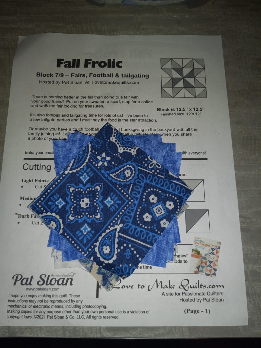 I have 6 blocks done of Pat Sloan's Fall Frolic and 3 more to go... Blocks 7, 8, &9.  I've had the patterns printed for a few weeks but just haven't made it to the cutting board.